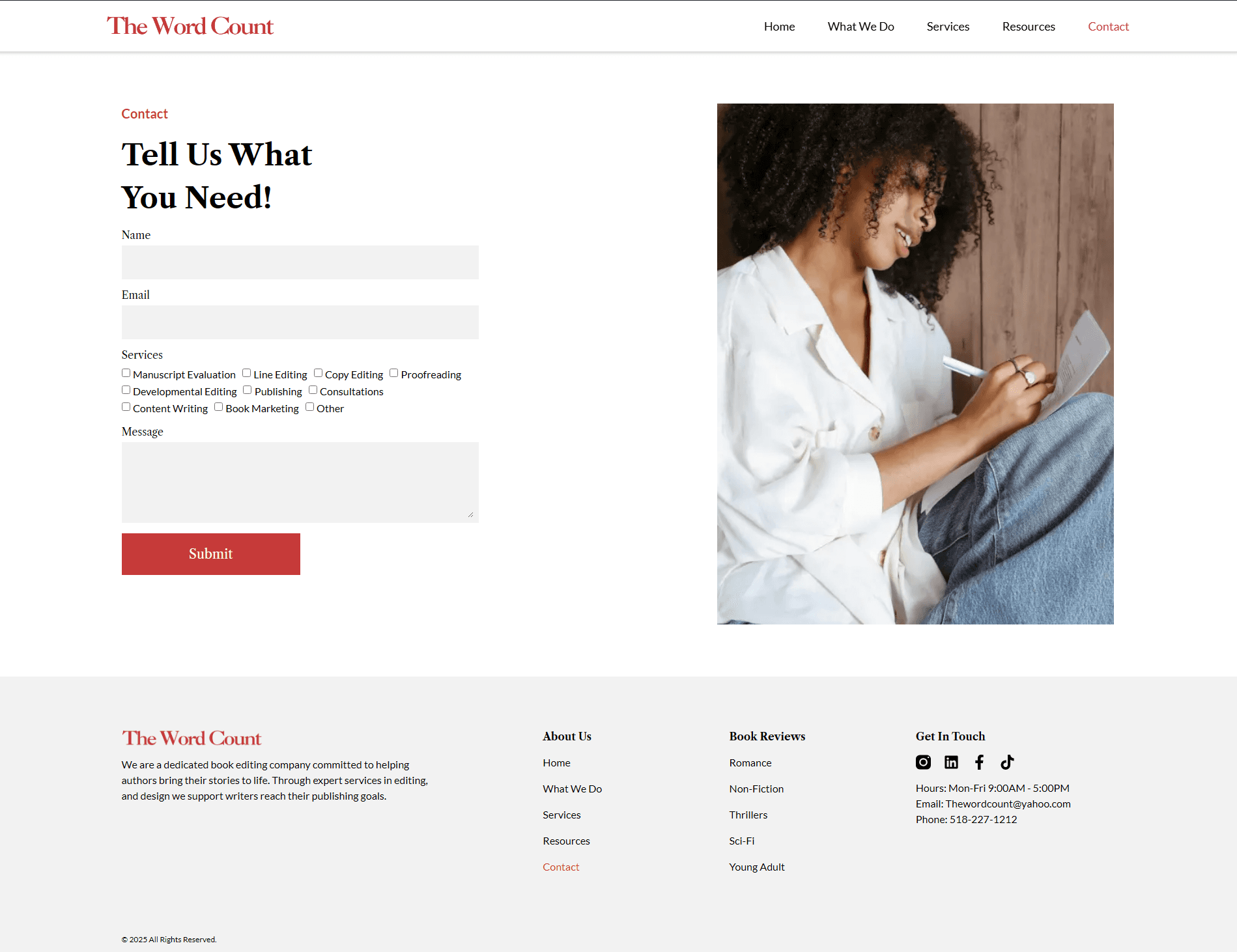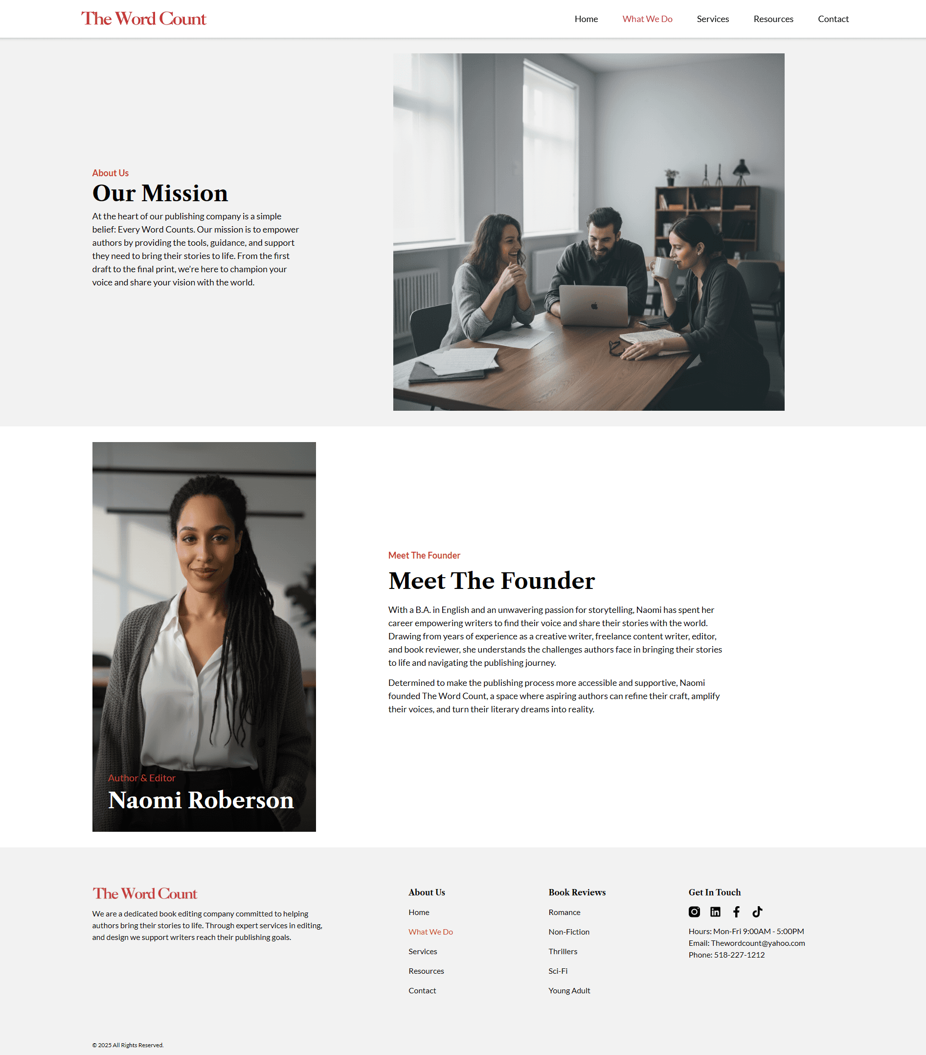 Maya has poured her heart into her first manuscript but feels overwhelmed by the complexity of the publishing world. She is visiting The Word Count for the first time, looking for guidance. She needs to quickly determine whether this agency is professional, credible, and capable of supporting her journey, and may hesitate if the site does not clearly communicate its services or guide her toward a confident next step.
