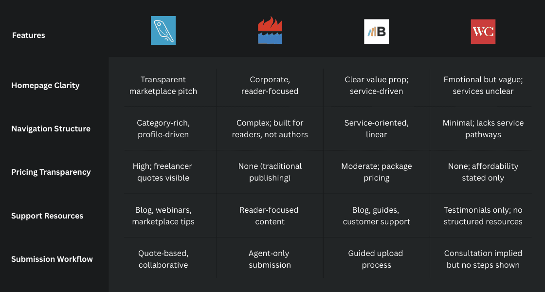 Following the heuristic evaluation, I examined how The Word Count compared to established competitors across homepage clarity, navigation, pricing transparency, support resources, and submission workflows.